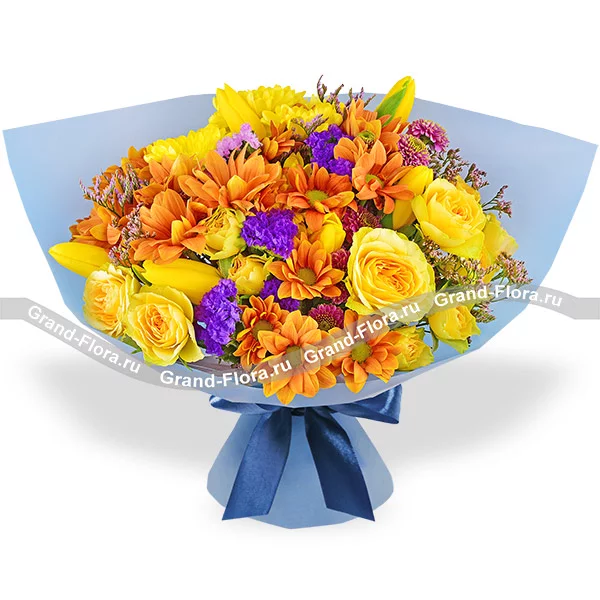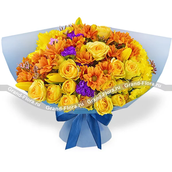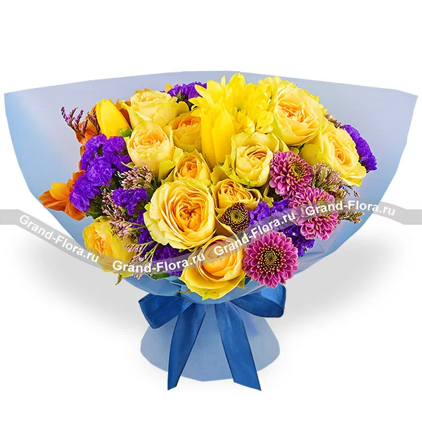Люкс: роза кустовая желтая - 6 шт., хризантема кустовая желтая - 3 шт., хризантема кустовая фиолетовая - 2 шт., тюльпан желтый - 9 шт., хризантема кустовая оранжевая - 3 шт., статица, лимониум, упаковка, лента. Примерный размер: 45Х45 см.